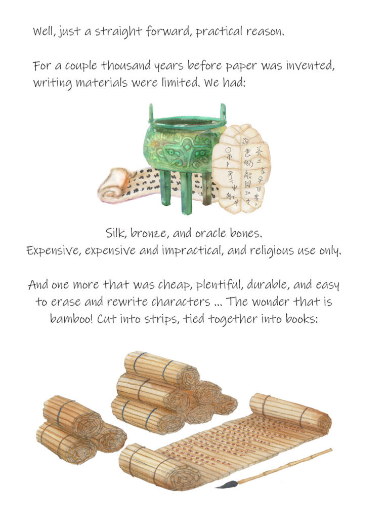 For a couple thousand years before paper was invented writing materials were limited. We had silk (expensive), bronze (expensive and impractical), and oracle bones (religious use only).
