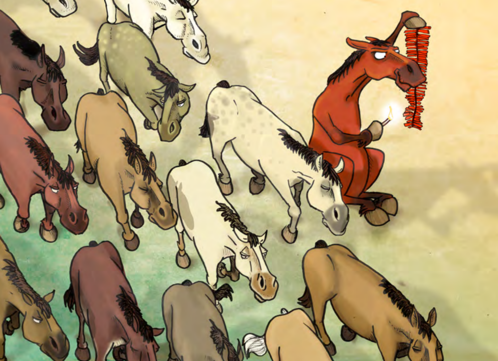 有一群马在原野间自在地休息着,但其中有一匹马总是捣乱,搞得大家都不开心,这匹马,就是他们之中的“害群之马”: 这个成语指那些在群体里捣乱、破坏大家团结的人。